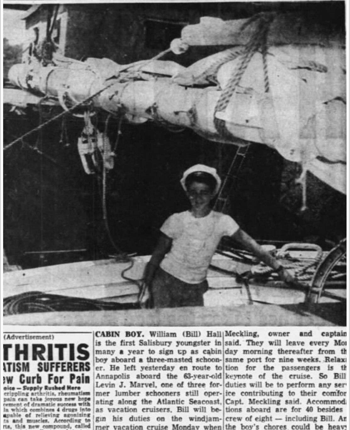 Bill wasn’t on board for the last voyage of the Marvel. Instead, he was in Baltimore meeting with a group of investors who were willing to support his purchase of the ship with his friend and fellow deckhand, Steve MacDougall. What had started as a summer job looked like a good business opportunity to the sailors. The current owner and captain, John Meckling was struggling to keep up financially, and had decided to turn over the business to a new syndicate. If the ship had not sunk, Bill and Steve would have taken on the refitting and running of a Windjammer business on the bay. ,